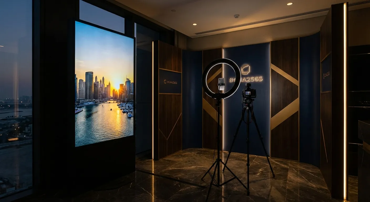 The visitor approaches, intrigued by the looping videos on screen. They step into the photo zone. Choose their dream — penthouse sunrise, marina sunset, family garden. And then they watch the magic happen: a cinematic clip, starring them, living the life your property promises.